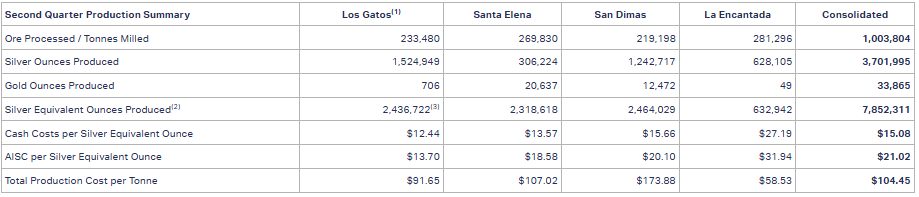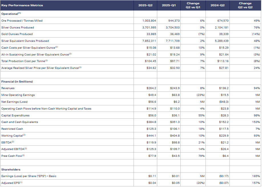 • Robust Silver Equivalent Production (+48% Y/Y): The Company produced 7.9 million silver equivalent (“AgEq”) ounces, including 3.7 million silver ounces, in Q2 2025 representing a 48% increase compared to 5.3 million silver equivalent ounces produced in Q2 2024.