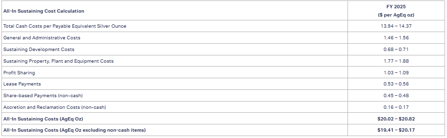 The Company is projecting its consolidated 2025 AISC to be within the range of $20.02 to $20.82 on a per consolidated payable AgEq ounce basis, in-line with the original guidance range of $19.89 to $21.27 with a 1% improvement on the mid-point average. Excluding non-cash items, the Company anticipates its 2025 AISC to be within the range of $19.41 to $20.17 per payable AgEq ounce. An itemized AISC cost table is provided below: