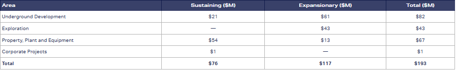 The updated 2025 annual guidance includes total capital investments of $82 million for underground development; $43 million in exploration; $67 million towards property, plant and equipment; and $1 million towards corporate innovation projects.