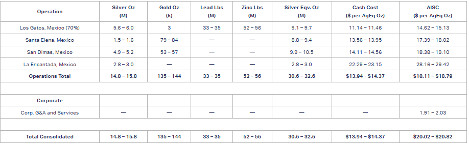 A mine-by-mine breakdown of the Company’s revised 2025 production and cost guidance is included in the table below. The Company reports cost guidance to reflect cash costs and all-in sustaining costs (“AISC”) on a per AgEq attributable payable ounce basis. The metal price and foreign currency assumptions that were used to calculate the numbers below were: silver: $30.00/oz, gold: $2,800/oz, lead: $0.95/lb, zinc: $1.25/lb and MXN:USD 19.5:1.