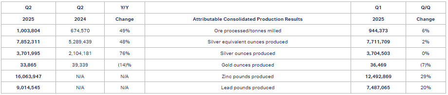 • Silver Production (+76% Y/Y): The Company produced 3.7 million silver ounces in Q2 2025 representing a 76% increase when compared to 2.1 million silver ounces produced in Q2 2024. Total silver production in the quarter included 1.5 million ounces of attributable silver production from Los Gatos.