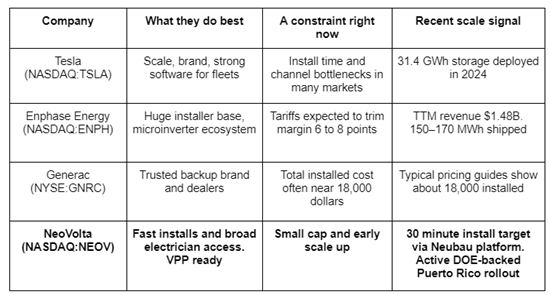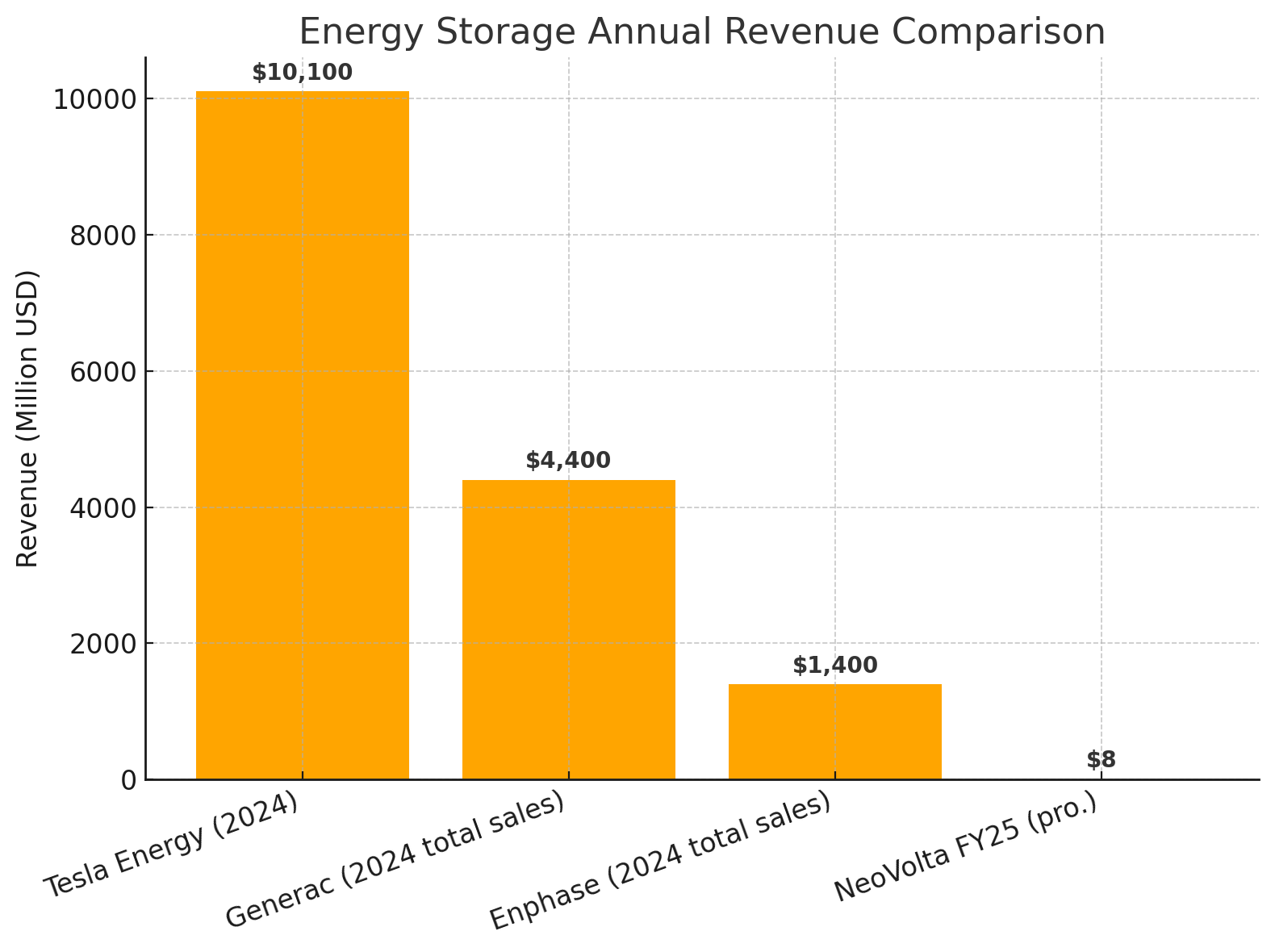 Pure-Play Status in a Crowded Market: Most competitors are conglomerates. Tesla is focused on cars. Generac is tied to generators. Enphase leans on solar inverters. NeoVolta (NASDAQ: NEOV) is one of the few public companies focused entirely on storage. For investors who want a direct way to play America’s $45 billion storage boom, this is it.