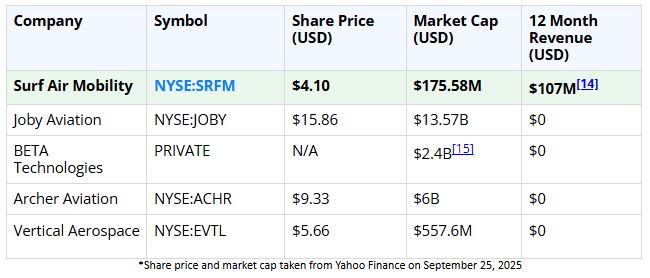 - Valuation: Despite delivering operational success, Surf Air’s market cap is just ~$175 million, a fraction of its revenue. Compare that to Joby or Archer, trading at 70x–100x revenue multiples.